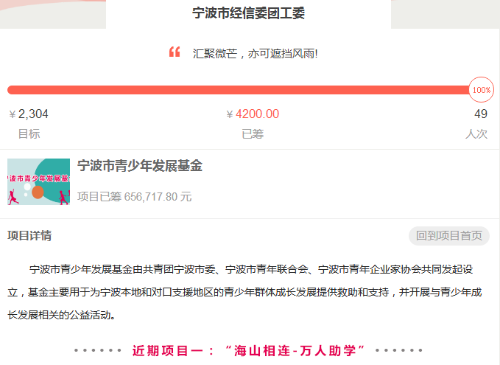 在为期两周的捐赠活动中,通过线下募集以及线上钉钉、微信等募集方式,各级团组织设计制作展架,宣传捐款活动,党员、团员争当先锋、做表率,通过现金捐款、微信及支付宝转账的形式奉献爱心,截至6月15日,已募集款项19896元,其中委机关及委属事业单位募集捐款4200元,宁波卷烟厂团委募集捐款5196元,银亿集团团委募集捐款6000元,富邦集团团委募集捐款3000元,荣安集团团委募集捐款1500元。
